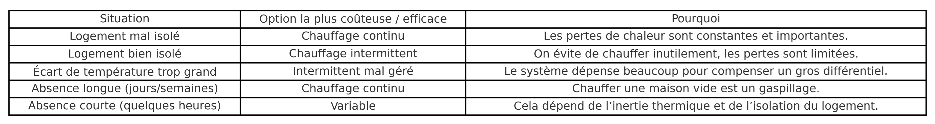 - Limiter l’écart de température : si tu chauffes à 20 °C, ne descends pas en dessous de 14–16 °C en ton absence.